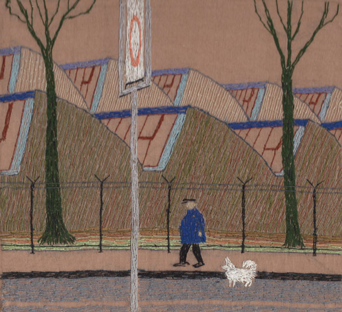 Fabrikgebäude mit Sheddächerreihen im Wedding, Grenzstraße · 13,7 x 15 cm · Nähgarn auf Baumwolle · 2020