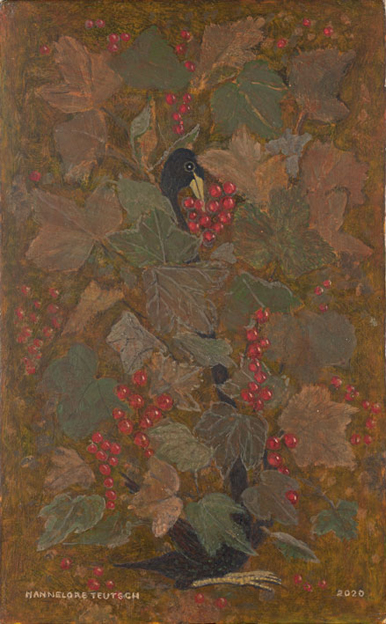 Vogel zwischen Johannisbeeren · 35 x 22 cm · Tempera auf Holz · 2020