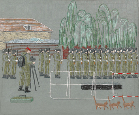 Übung des Ehrenbataillons in der Zitadelle Spandau · 12,4 x 15 cm · Nähgarn auf Seide · 2021