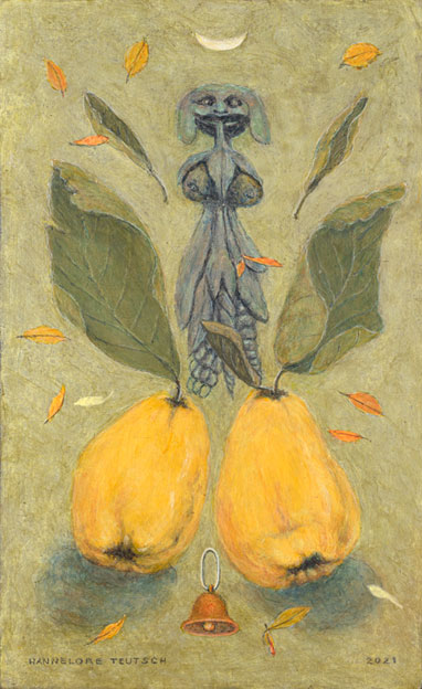 Zwei Quitten mit kleiner Hexe · 35 x 22 cm · Tempera auf Hartfaser · 2021