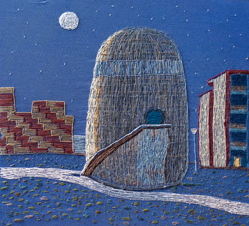 Der Trudelturm in Adlershof · 132 x 14,4 cm · Nähgarn auf Seide· 2025
