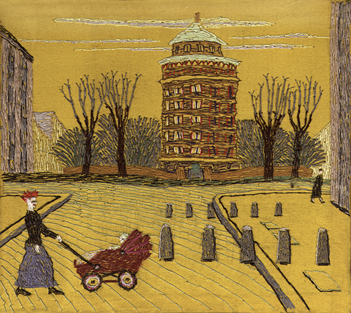 Straßenszene am Wasserturm · 13 x 14,5 cm · Seide auf Seide · 2005