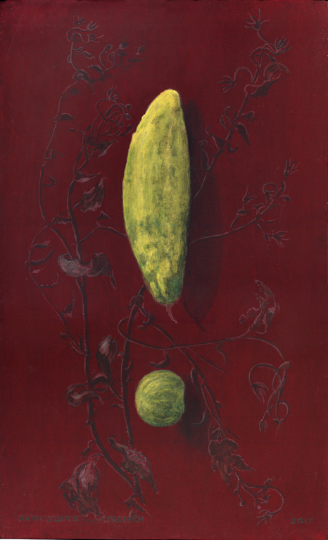 Gurke, Tomate und Gurkenkraut · 36 x 22 cm · Tempera auf Holz · 2017