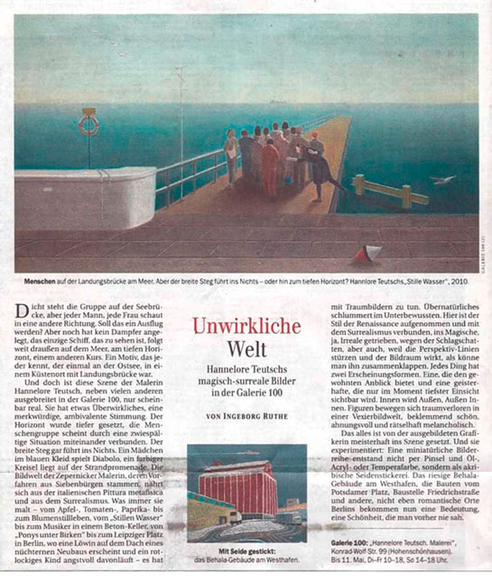 Artikel in ZeitungenChristine Tilmann 19.8.2023, Märkische Oderzeitung »Trifft ein Sauerampfer auf einen Luftgeist« "Oh du schöner August" Schul- und Bethaus AltlangsowChristiane Meixner 1.9.2022, Tagesspiegel "Präziser Blick für den Alltag Selbstvergessen, ruhelos, ganz für sich" diekleinegalerie Berlin, Friedenau Silvia Fichtner 13. Mai 2021, Märkische Oderzeitung Ein Panther am Strand, was tut er da? Bilder von Hannelore Teutsch in der Galerie Bernau Christine Tilmann 11.2.2020, Märkische Oderzeitung »Mann und Frau im Gestrüpp« Ein Bildband zeigt ihre Werke der letzten Jahre. Christiane Meixner 5.10.2019, Tagesspiegel, Mehr Berlin »Ander(e)s sehen«, Bild und Text Karen Grunow 11.4.2019, Märkische Allgemeine »Bilder und Plastiken in einer Schau« Neue Galerie Wünsdorf Dietmar Pühler 7.8.2018, Ostsee-Zeitung »Bilder mit ‚leisem Charme’« Kunstpavillon Heringsdorf Klaus Hammer 24.4.2018, Neues Deutschland »Die Surrealität der Realität« Galerie 100, Berlin Silvia Fichtner 3.1.2018, Märkische Oderzeitung »Bilder wie Brüder« Kloster Chorin, Infirmarium Ingeborg Ruthe 21.1.2016, Berliner Zeitung »Vor und hinter dem Horizont« Galerie Ei, Berlin Klaus Hammer 3.2.2016, Neues Deutschland »Bild und Wirklichkeit« Galerie Ei, Berlin Silvia Fichtner 14.7.2014, Märkische Oderzeitung »Geprägt vom Innehalten« EWE Kunstparkhaus Strausberg Elke Lang 22.9.2013, Märkische Oderzeitung »Eintauchen in rätselhafte Bilderwelt« Burg Beeskow Ruth Buder 19.9.2013, Märkische Oderzeitung »Hannelore Teutsch stellt in der Burg-Galerie aus« Burg Beeskow Ingeborg Ruthe 14.4.2011, Berliner Zeitung »Unwirkliche Welt«, Galerie 100, Berlin Jörg Brause 30.6.2010, Märkische Oderzeitung » Wie aus der Zeit gefallen« Galerie im Rathaus in Biesenthal Maury Gollini 29.11.2008, Le Républicain Lorrain »Réel et imaginaire« zur Ausstellung in der Université Paul Verlaine, Metz, 2008 Ingeborg Ruthe 2.9.2006, Berliner Zeitung »Beklemmend schöne Bilderrätsel in Rheinsberg«, Schloss Rheinsberg Michael Dewey 2005, Bucher Bote »Ein Künstlerpaar in Panketal« Ingeborg Ruthe 20.6.2002, Berliner Zeitung »Das unsichtbare Dreieck und die Kugel« Galerie am Prater, Berlin Anna Scheer 22./23.6.2002, Märkische Oderzeitung »Die Stadt wird zum Traumraum« Galerie am Prater, 2002 Harald Kretzschmar Mai 1995, Neues Deutschland Freie Berliner Kunstausstellung »Ein guter Jahrgang bei Namhaften wie Namenlosen«